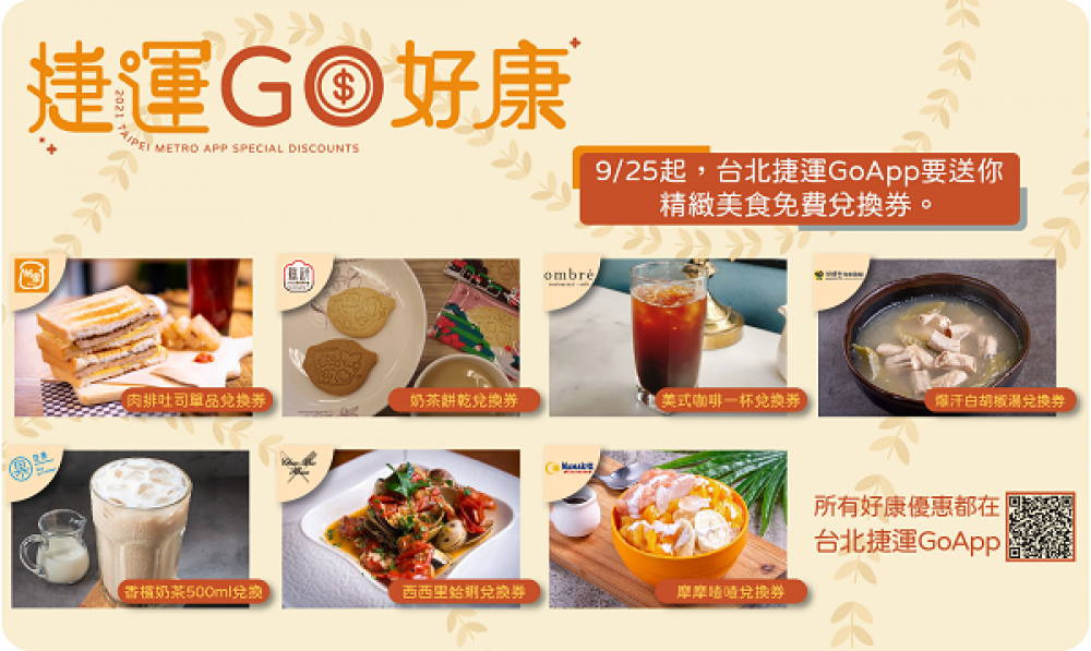 臺北捷運生活圈福利享不完,加入「台北捷運GO」APP會員,每個月25日的北捷會員日,持續好康大放送,9月25日(六)至26日(日)期間,豪送限量1.7萬份免費券,計有包果、巧哚洋房、Ombré餐廳、朝露炭烤土司、郭元益、星馬料理Mamak檔,以及甘榜馳名海南雞飯等7間知名店家大呼過癮。同時,「台北捷運GO」APP的「線上商城」9月30日前,還可參加總價值超過3,500元驚喜福袋與LINE POINTS 最高100點抽獎活動。