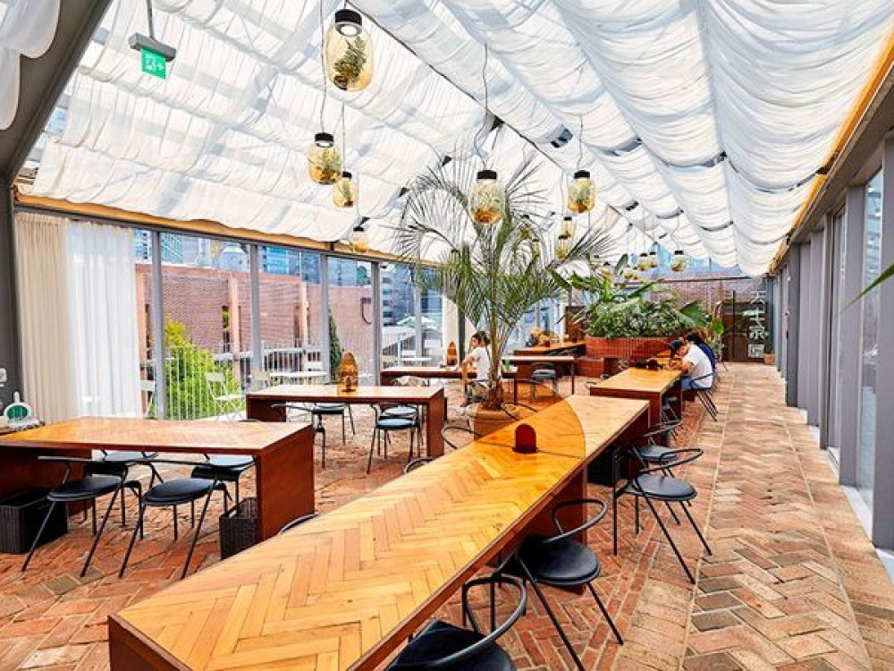 如果走累了,可以前往三樓的天上家屋露臺咖啡廳坐坐。咖啡廳內部設有以由白色遮陽篷遮蔽的玻璃屋頂,顯得相當高雅,並且擺設了許多綠色植物,讓人感到溫馨又輕鬆自在。在戶外露臺坐下,一邊享用清涼飲料和甜點,一邊俯瞰聖水聯邦的中央廣場,這樣的時間也相當愜意。