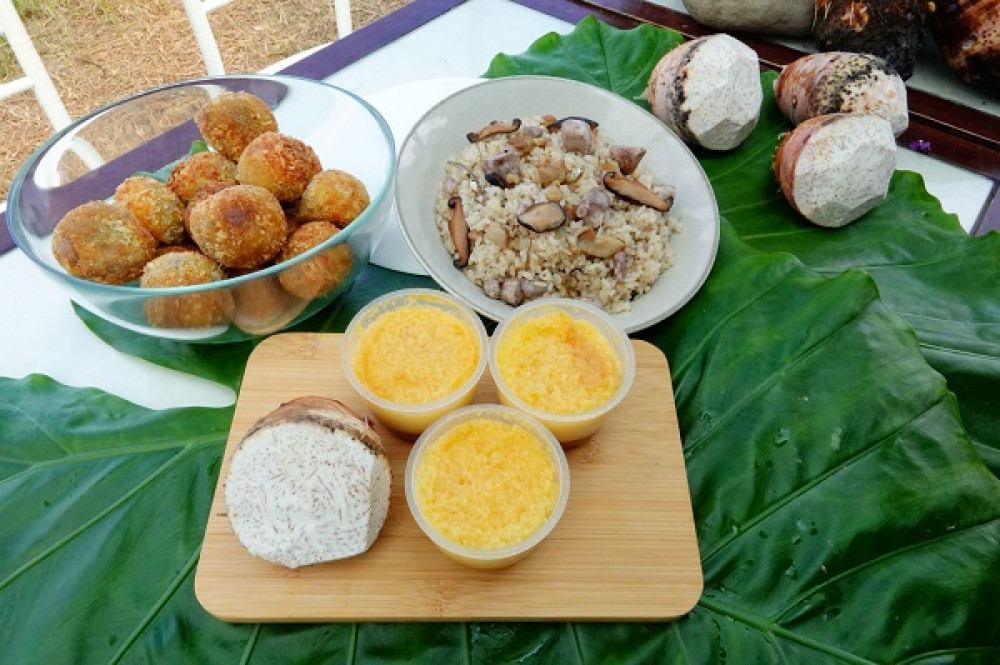 青農王御庭推動金山在地跳石芋產業,14日在金山中角灣國際衝浪基地設置跳石芋產品快閃攤位,挑動民眾食慾,邀請民眾支持跳石芋特色農產。