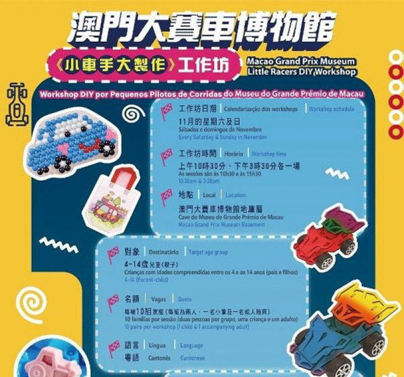 澳門大賽車博物館將於11月周末日舉辦共16場名為《小車手大製作》的親子工作坊,25日起,公眾可透過網上報名參加。澳門格蘭披治大賽車是一個標誌性的盛事活動,旅遊局舉辦周邊活動加強「旅遊+體育」品牌協同效應,帶動大賽車文化的傳播和傳承,營造賽車盛事氛圍。