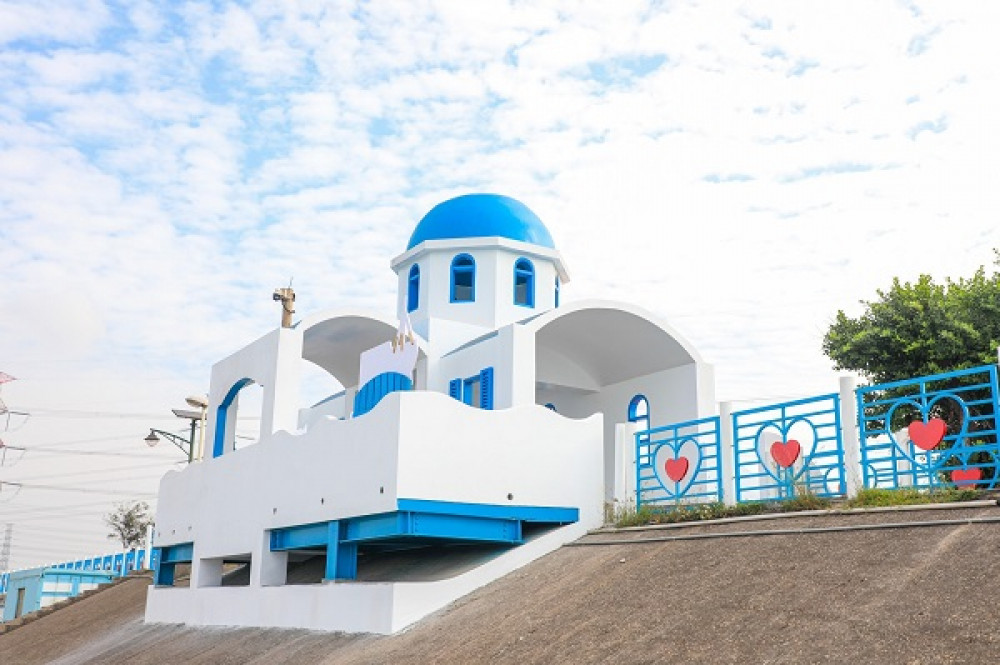水利局說明,「台中市龍井排水及鄰近排水環境改善工程」沿龍井排水旁海岸線,將水利設施融入如白牆藍瓦、渾圓圍牆、石板街道、柱式建築等希臘元素設計,藉由浪漫純美的希臘地中海風格、3D彩繪水利構造物美化,積極改善排水環境景觀,串聯自行車專用道,讓遊客有停留觀景點,欣賞漁港之美,滿足民眾觀光遊憩需求,朝「小希臘」區域整體環境目標發展。