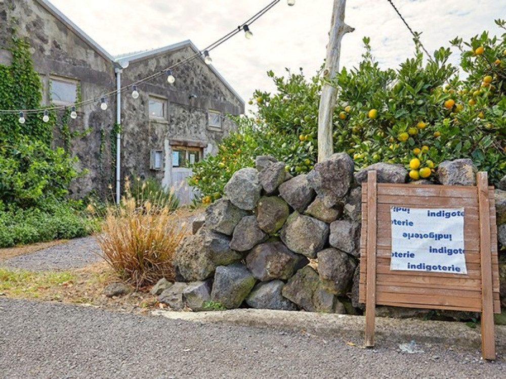 Indigoterie將老舊的橘子倉庫改造為咖啡廳兼複合品牌店。從粗獷而樸素的建築外觀,可以感受到濟州島質樸的面貌。內部作為咖啡廳與複合品牌店,四處都以石塊做裝飾,呈現出質樸又復古之美。咖啡廳裡的人氣飲品要數以濟州島特產橘子所製作的橘子氣泡飲與茶,由於是產地直送,相當新鮮,喝起來酸酸甜甜,值得一試。