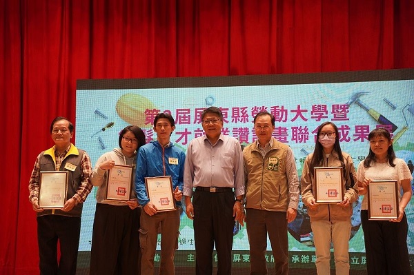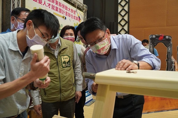 屏東縣政府7日(二)在縣府大禮堂舉辦第2屆勞動大學暨銀髮人才就業讚聯合成果展,學員與民眾熱情參與,現場展現各種專業課堂成果。縣長潘孟安下場體驗木工、泥水鋪墊,手法專業嫻熟獲滿堂喝采。其中,完成的木作家具,將贈予社團法人屏東縣百工師傅志願服務協會代表,供百工師傅團行善使用,意義非凡。