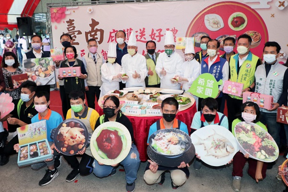福虎年將近,台南庇護工場準備好多項好禮跟大家分享,9日(四)舉行年菜推銷記者會,台南市長黃偉哲邀請各區農會協力行銷庇護工場產品,推出年菜與多項好禮預購,搭配振興五倍券更有加碼優惠,邀請社會大眾力挺庇護工場,踴躍訂購。