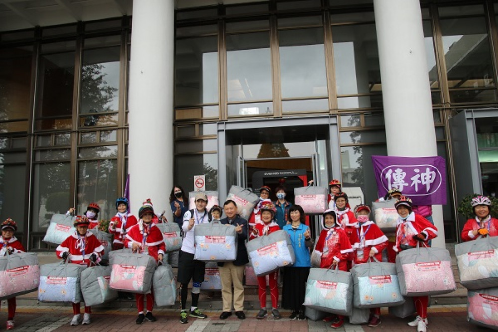 「我們不做家庭的負擔,要做社會的新祝福」,由台灣傳神居家照顧協會李志偉牧師帶領的第八屆「聖誕傳騎寒冬送暖-單車環台」活動,10多名不老騎士們20日(一)首站由臺東出發,副縣長王志輝帶領社會處團隊迎接,聖誕佳節前夕捐贈冬被,為臺東縣獨居老人傳愛,將關愛的溫暖傳送到社會每處角落,其中,隊員中最高齡為93歲,展現旺盛精神與熱情,獲得滿堂喝采與敬佩。王志輝代表縣長饒慶鈴肯定不老騎士「老當益壯」,希望他們健康愉快一路平安。