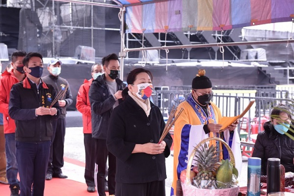花蓮縣太平洋觀光節跨年演唱會祈福敬拜儀式26日(日)上午在東大門夜市旁廣場舉辦,縣長徐榛蔚行三跪十二叩首最敬禮,祈求諸神菩薩賜福花蓮風調雨順,活動圓滿順利,虔誠祈求上蒼庇祐花蓮。
