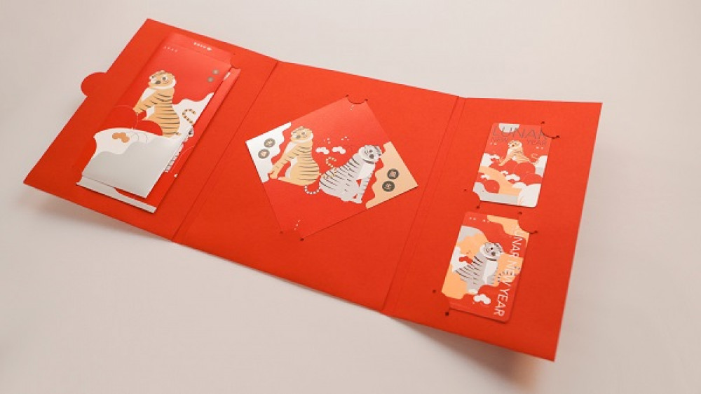 生肖套票附贈獨家設計紅包袋與春聯,以吉祥紅色為底,金銀雙虎坐於山頂,運用燙金與燙銀工藝,細緻的製作工法中,展現濃厚年節氣氛,作為春節祝福好禮值得典藏。