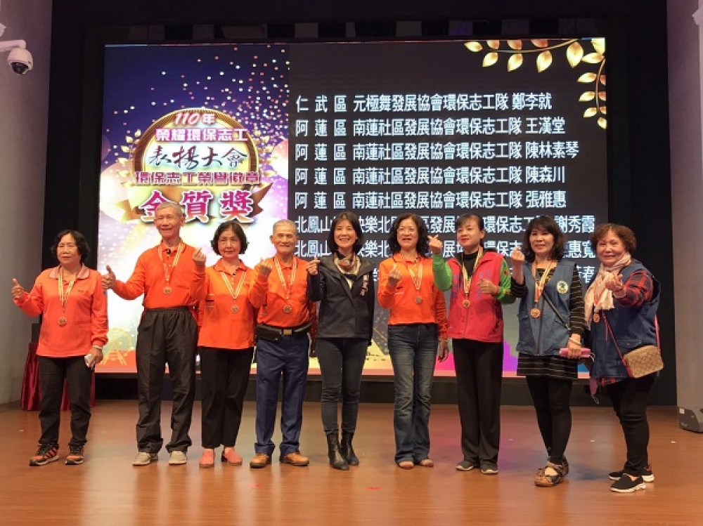 志工小隊共6隊獲卓越獎,其中「糖廠社區發展協會環保志工隊」開創環境教育體驗課程,包含香蕉絲手抄紙、悠遊糖鄉桌遊、白玉蘿蔔採果、地球種子-植物苔球等,推廣成效顯著,是全國各地社區爭相學習熱點;另外,「快樂北門社區發展協會環保志工隊」將髒亂空地改造成文創基地,推動手作環保產品,營造友善街貓社區,減少流浪動物影響環境衛生;「三苓里環保志工隊」透過雞蛋殼再利用與環境美學結合,將髒亂空地綠美化,因應疫情宣導民眾口罩如何正確消毒重複使用與丟棄方式,將環境資源再利用落實生活中;「文華里環保志工隊」雖僅成立3年,但積極辦理環保志工課程、會議、活動,推動髒亂點清除、環保政策宣導,協助獨居長者住家環境維護;「中里林仔邊社區環保志工隊」推動有機疏菜種植計畫,將社區樹葉集中有機蔬果園區作為堆肥,在社區建置雨水撲滿、廢食用油製成手工皂、生廚餘製成環保洗碗劑等;「三民西區河堤環保志工隊」定期舉辦河堤清潔日、愛河水質巡檢檢測、跳蚤市場、音樂藝術季等,將愛河環境與人文藝術結合。