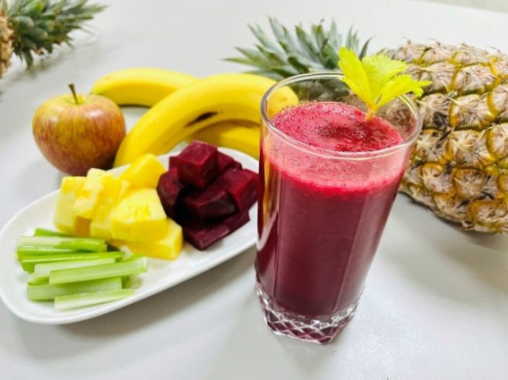 提供4人份養生蔬果汁作法,材料:鳳梨1/8顆、小蘋果1顆、香蕉1根、甜菜根100克、西洋芹30克、冰塊、水適量。做法:所有蔬果洗淨後去皮切塊備用;先加少許的水(100 cc)以高速果汁機攪打所有食材至均勻混合;依個人喜好加適量水(400-500 cc)及冰塊調整濃度後,再攪打5-10秒即可,一人份熱量共94大卡,碳水化合物18克、蛋白質1.4克、脂肪0.2克、膳食纖維2.6克。