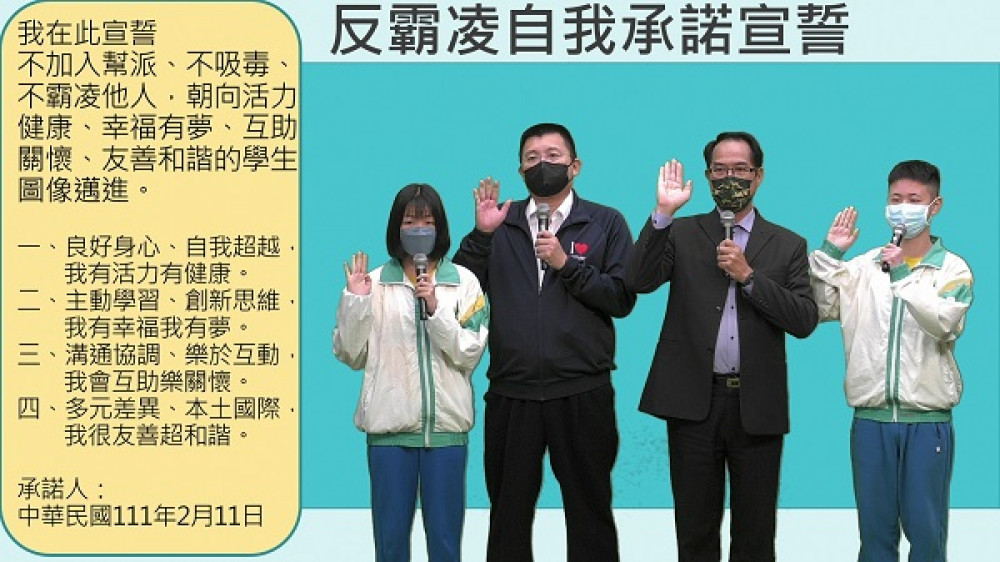 視訊會議由林政宏帶領新生國中師生透過網路直播共同宣讀誓詞,與現場師生代表共同簽署約定,指出宣示跟簽署活動,代表每個人對自己的承諾。每個人要對自己的選擇負責,除持續反毒、反黑、反霸凌外,面對新興資訊科技的網路世界,更要讓媒體識讀的網路素養,成為現代生活的習慣與要求。