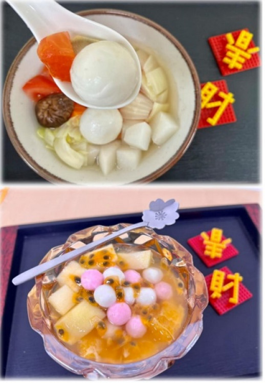 「果香玉露湯圓」運用玉露茶包與柳丁為湯底,搭配無餡小湯圓減少糖分攝取。1顆包餡鹹湯圓約70大卡,體重60公斤者需健走20分鐘(4公里/小時)才能消耗熱量。「五行時蔬湯圓」使用紅蘿蔔、高麗菜等熬煮湯底替換爆香油蔥酥,還可代替當餐主食,避免攝取過多的澱粉。