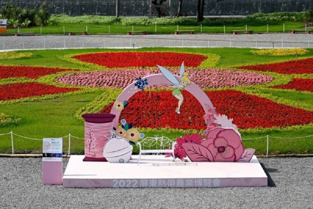 2022屏東熱帶農業博覽會花海地景以速綠草、百日草、海棠、向日葵、波斯菊、鼠尾草等草花組成各式圖樣,圖案以迪士尼經典角色做為發想,規劃五大主題包含,星球荒地,搭配格魯特,以倒木石塊與多肉植物,象徵宇宙星球的蠻荒;箭巡航,搭配三眼怪,以堆疊的草花火箭象徵飛向宇宙浩瀚無限;猴面外星人,搭配東方草鶚,常被誤為外星來的鳥類,以躲在草中的外星人為主題;花之星,搭配奇妙仙子,中央圓形花圃象徵奇妙仙子誕生地,給予參觀民眾祝福;外太空星系,搭配尤達寶寶,以草花排出星系模樣象徵星際大戰中星球的多元。