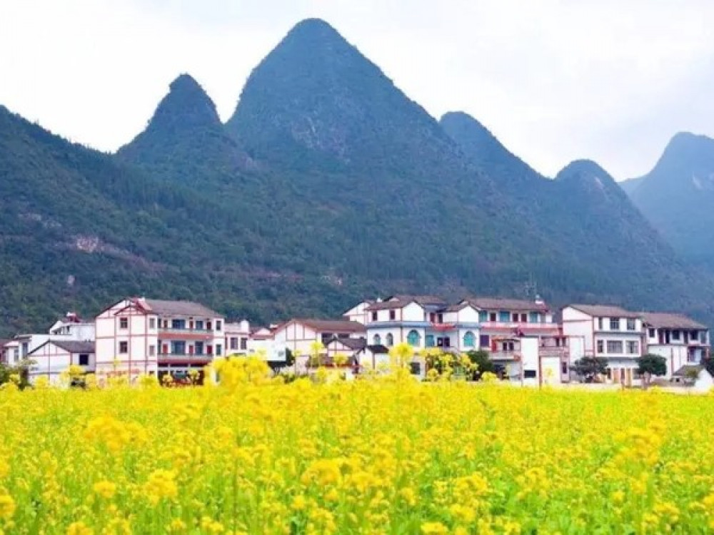 在黔西南州興義市萬峰林街道萬福村,油菜花相繼開放,一片勃勃生機,金黃的油菜花旁是白牆灰瓦的布依村寨,如夢如幻,彷彿世外桃源一般。在盤州市新民鎮萬畝梯田裡,油菜花開得正好,和熙的春風送來陣陣甜香,新民鎮萬畝梯田今年種植了十幾個品種的油菜,用不同顏色的菜花勾勒出奮鬥的圖案和造型。