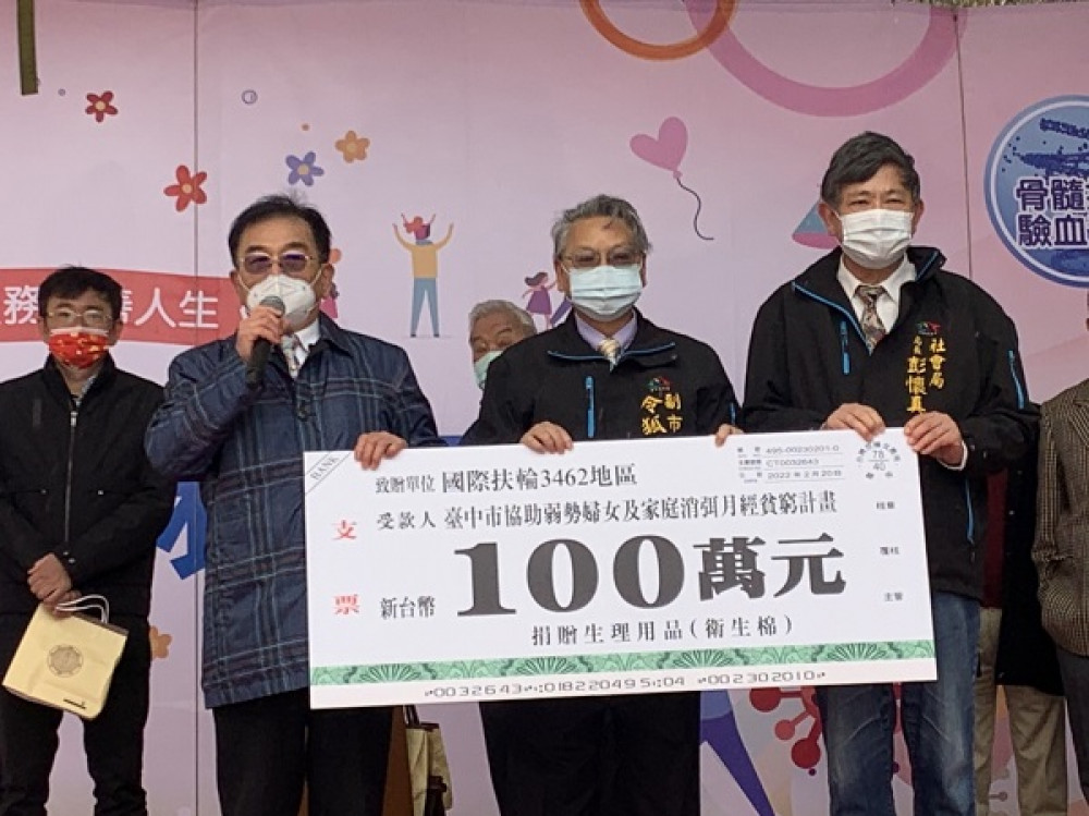 弱勢婦女與家庭因經濟困窘,購買衛生棉成了負擔。國際扶輪3462地區總監謝漢金號召66個扶輪社,共同響應台中市社會局「協助弱勢婦女及家庭消弭月經貧窮」計畫,20日(日)舉辦捐助價值新台幣100萬元生理用品衛生棉,副市長令狐榮達感謝國際扶輪3462地區發揮超我服務精神,集結各社發揮愛心,帶動台中市關懷社會的風氣。