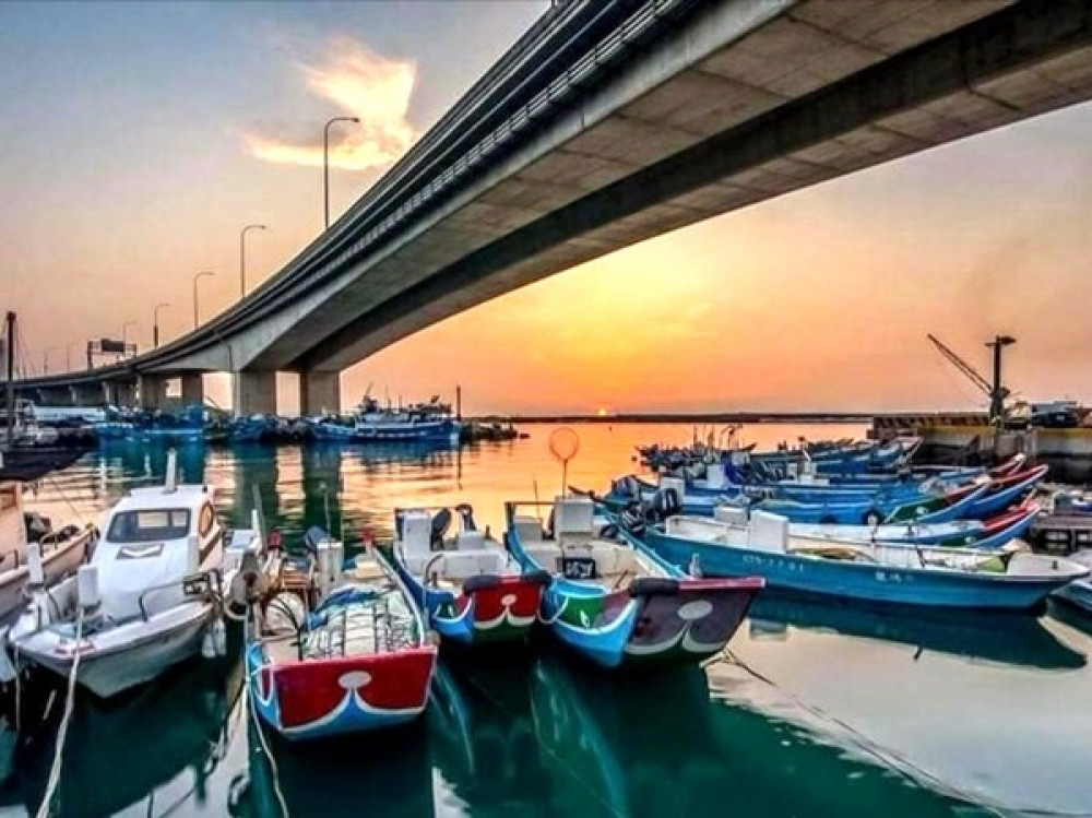 繼續前行達下罟子漁港,除了可見傳統藍色船身的舢舨船,也因漁港面朝西方,而成了最佳夕陽觀賞景點之一。當夕陽西下時伴隨著橫越港口的西濱高架快速道路,海水映著映照著寧靜的漁港,光影搖晃為來到這座小漁港的人們,帶來意外絕美的一齣讓人屏息的日落大戲。