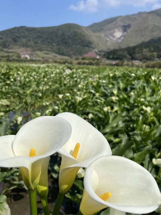 2022陽明山竹子湖年度盛事「海芋季」18日(五)開幕,粉色的櫻花已開至尾聲,白色的海芋開始接力綻放,上山賞花遊玩,走入海芋田中,享受竹子湖的山景與花景交映,幸福滿溢。