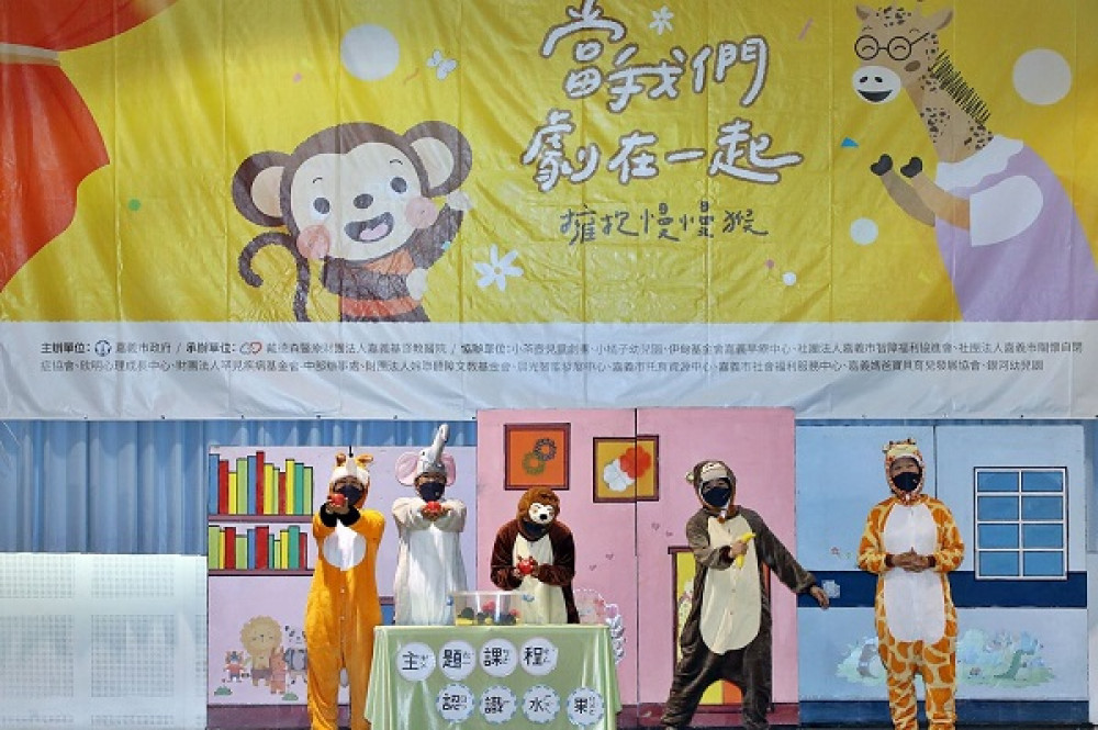 為能廣泛建立社區民眾對發展遲緩兒童與其家庭「友善接納」與「同理陪伴」社會融合的行動,嘉義市政府委託戴德森醫療財團法人嘉義基督教醫院16日(六)在嘉義市兒童福利服務中心辦理「當我們劇在一起~擁抱慢慢猴」兒童劇場活動,150個有6歲以下兒童家庭報名,透過戲劇讓大家呵護支持發展遲緩兒童與家庭,嘉義市長黃敏惠與大小朋友一起歡喜看戲同歡。