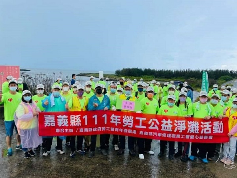 嘉義縣政府與嘉義縣汽車修理職業工會愛心慈善會在布袋鎮好美里辦理淨灘,勞青處長陳奕翰、愛心慈善會長莊永長與模範勞工、各工會會員熱情參與,呼籲垃圾減量從源頭做起,共同守護海洋生態環境。