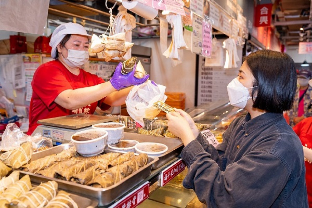 活動贈送的名粽每份價值135元,樣樣都是攤位經典的熱銷商品,立家湖州粽的蛋黃鮮肉粽不僅用料實在、口味獨特,加上多年的包粽好手藝,是端午過節的好選擇;南園食品店的湖州鮮肉蛋黃粽,內餡放入整條醃漬入味的梅花肉與整顆蛋黃,每口紮實,味蕾享受再升級;合興糕糰店的火腿鮮肉粽,糥米口感彈牙,搭配火腿加鮮豬肉雙重肉感,讓消費者有加倍好感受。