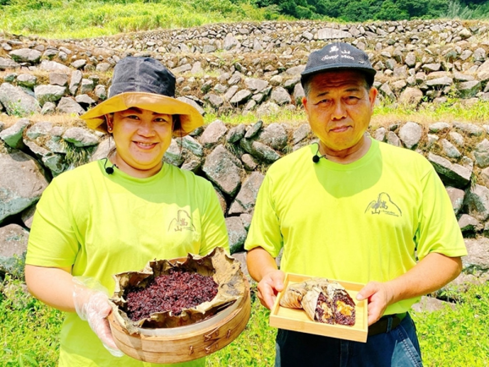 百年砌石梯田是石門嵩山社區的特色,但是還有一個比百年梯田更「有年歲」(台語)的特色-千歲米!而千歲米是社區一群不服老又有韌性的優秀耆老第一批種植出的黑米,農民年紀加起來超過一千歲因而得名,嵩山社區理事長王綸表示,千歲米是黑米,比一般的白米富含更多礦物質口感也更Q彈,推薦與家人、朋友一同製作飯糰,簡單又美味,古早味飯糰的製程方法如下:準備荷葉、煮熟的千歲米、喜愛的配料,如海苔、水煮蛋、菜脯都是傳統農村必備的配料,將千歲米舖平在荷葉上,再依序放入喜愛的食材,用荷葉捲起捏緊,即能完成一個口感Q彈,米香獨特的「千歲米飯糰」。