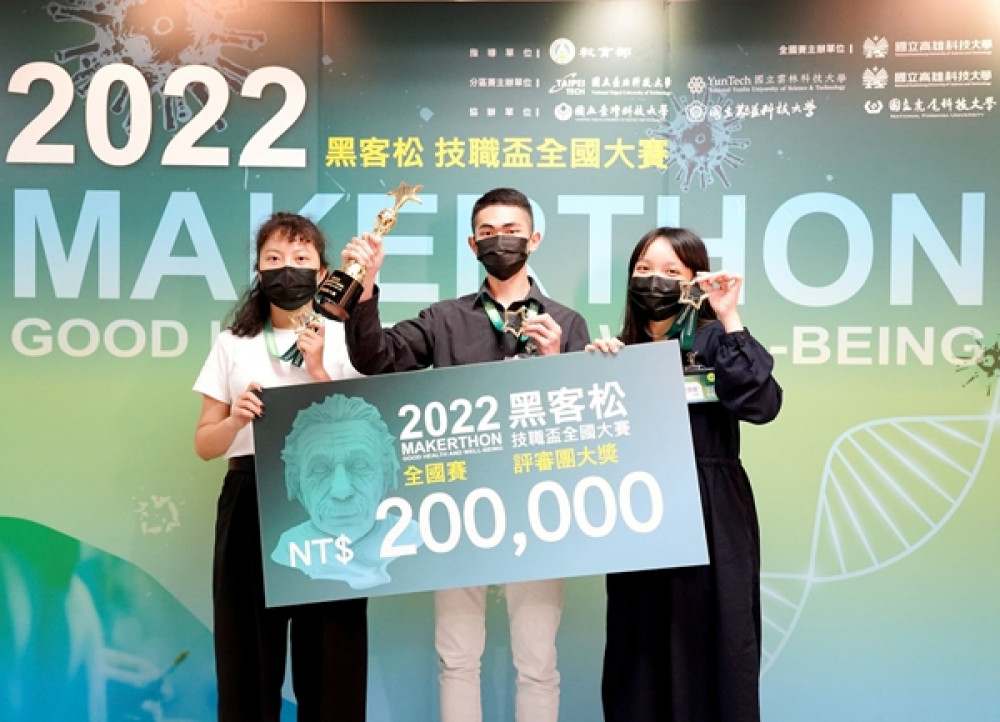 為深化技專校院學生創意思考及動手解決問題的能力,教育部111年度辦理第5屆技職盃「黑客松」全國大賽,由北、中、南分區賽選拔入圍計72隊團隊共204人,於5月14、15日齊聚國立高雄科技大學進行總決賽,再次展現各團隊的創意及團隊實作能力,並角逐評審團大獎等12個獎項。今年「評審團大獎」由國立臺北科技大學互動客團隊劉芝良、張永義、王品勻同學獲得,參賽作品為「綠窗花 清淨空氣的社區植栽運動」,參賽者在競賽過程中都充分展現其創意技術與設計能力。