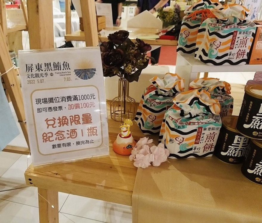 民眾現場消費滿500元,即可獲得東港在地海產餐廳優惠券,有「金溢饌海鮮餐廳」的泰式黑鮪魚、珍珍海鮮餐廳的九折優惠券、「佳珍海鮮餐廳」的酥炸鮪魚卷、「王匠生魚片」的鮮魚味增湯。消費滿1000元,可以加價100元兌換今年黑鮪魚季限量版的「烏龍茶燒酎」紀念酒 1 瓶,數量有限,換完為止。