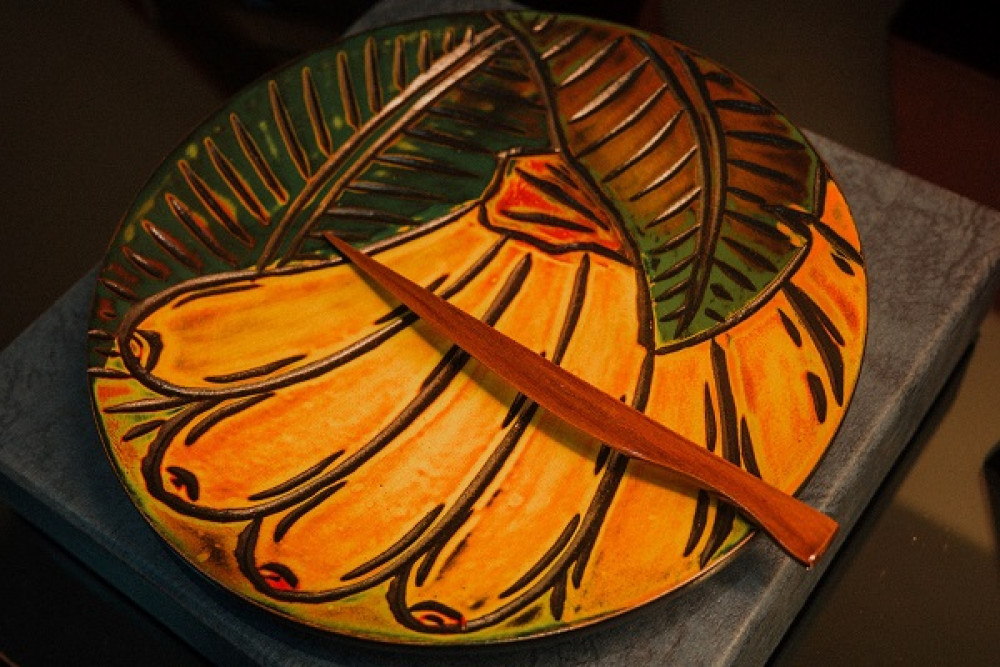 台中是漆藝、木藝重鎮,樺泰漆器入選工藝品類產品「漆藝蓬萊塗點心皿(香蕉)」,結合「蓬萊塗」的漆藝和雕刻技法,將台中特色水果香蕉的圖紋雕刻在胎體上,形成美麗的立體圖紋,加上天然色漆、綠葉為底色,造型質樸,作工精細又不失童趣,兼具實用性和藝術性。