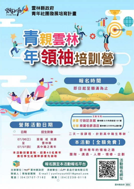 為強化青年領導統合與競爭力,雲林縣政府7月6日(三)至7月7日(四)在行啟記念館首次舉辦2天1夜「雲林青年領袖培訓營」,即日起開放報名,凡設籍雲林縣或就讀雲林縣高中職青年皆可報名。