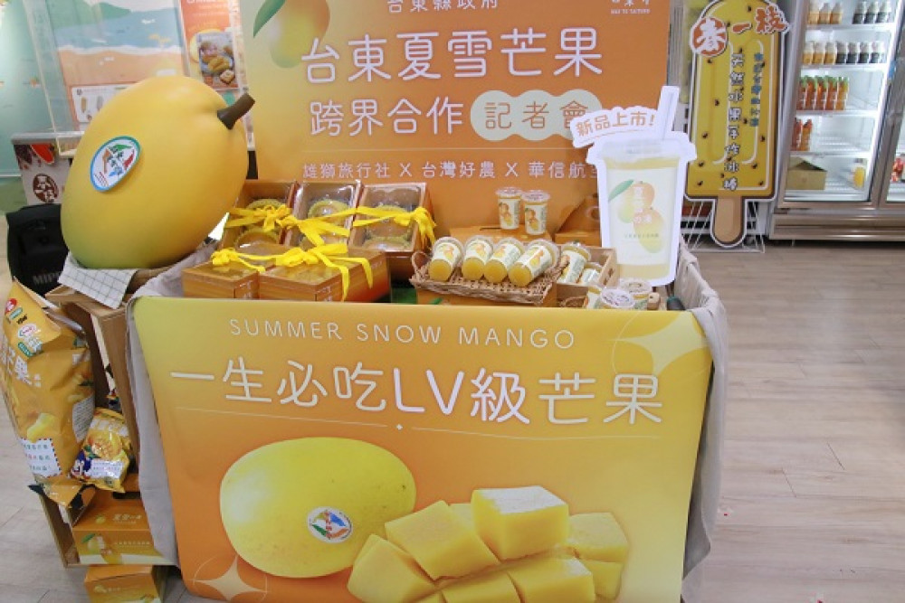 有芒果界LV稱號的「臺東夏雪芒果」每年6至7月盛產,臺東縣政府積極多元推廣,透過電商通路台灣好農串聯旅遊運輸業者共同行銷,22日(三)舉行跨界合作記者會。縣府與雄獅旅行社合作,在鳴日號列車供應夏雪芒果鮮果切盤,另配合臺東國際熱氣球嘉年華即將登場,華信航空7月9日起推出週末搭乘松山往返臺東班機,機上免費提供夏雪芒果蒟蒻凍飲,讓各地旅客不管從鐵路或飛機,都可以享受到夏雪芒果的好滋味。
