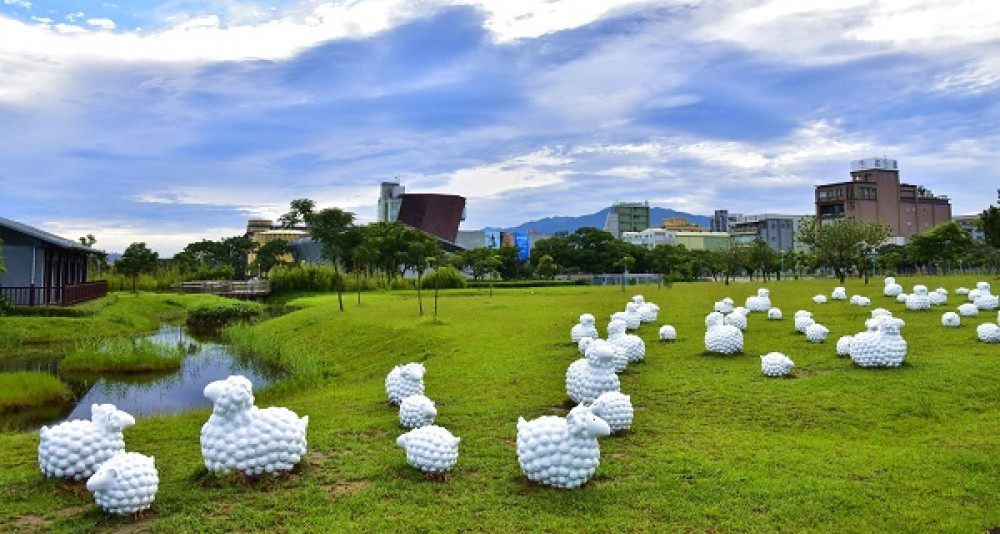 新北考古公園生態河道南側的大草地,最近出現一群雲朵般毛茸茸的新朋友,非常吸引觀眾的目光。十三行博物館與知名藝術家蔡坤霖合作,將藝術品《詩步領羊》放置在八里平原,營造出有如西歐農場般的氛圍。《詩步領羊》作者蔡坤霖創作概念來自在英國留學時,首次在鄉間看到大批羊群,心情備感療癒,創造這批兼具童趣與正能量的綿羊造型作品。