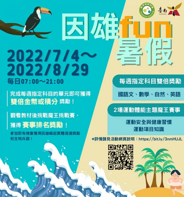 由教育部委託台南市教育局開發的遊戲式學習平臺「因雄崛起」網站,暑假期間推出「因雄fun暑假-快樂動一夏」全國挑戰賽,活動7月4日開跑,國中小學生可先閱讀運動主題教材再進行答題,完成指定條件後,獲線上虛擬獎勵「光輝系列生物兵器」,以及限定「因雄崛起logo運動毛巾」、「因雄崛起角色絨毛吊飾」等獎品。