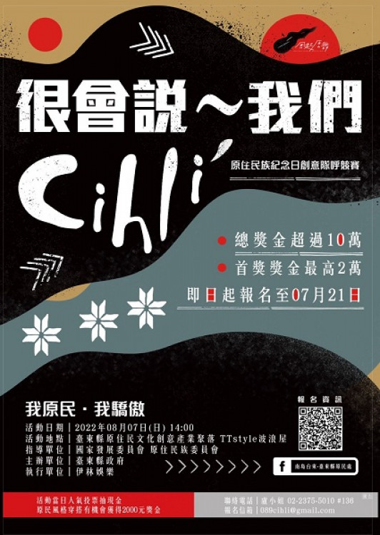 「很會說~我們·cihli'」原住民族紀念日創意隊呼競賽即日起至7月21日下午5點止,邀請13 歲以上至 45 歲以下青年組隊踴躍報名,入圍名單26日公布,決賽訂8月7日舉行。特優隊伍可獲新台幣2萬元與獎狀一幀,優等可獲得新台幣1萬2千元與優等獎狀一幀,另有超人氣獎、原住民風采獎等豐富獎項。