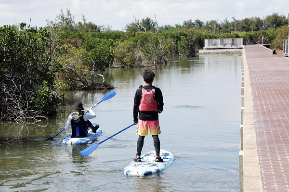 整修後的棧道長456公尺、寬3公尺,平緩舒適,退潮時可近距離觀賞招潮蟹、彈塗魚、、盤根錯節的紅樹林根系,非常適合親子同遊。沿途設置遮陰涼亭、景觀平台等景點,讓民眾散步途中可以稍作休息,或與美景拍照。