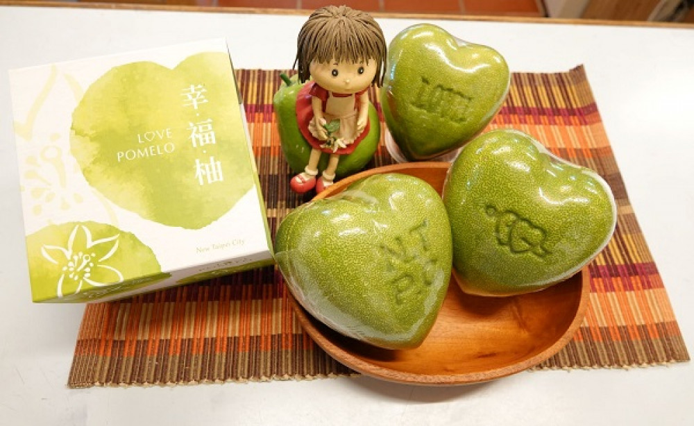 搭配七夕情人節,八里區農會推出帶有LOVE、囍等幸福字樣的心型柚子。農會為創造市場差異、提高文旦柚價值,種植心型柚,每年5月時,柚子果實約長成雞蛋大小,開始將文旦柚套上不同字樣的外框塑型。八里區農會推廣部指導員同時也是農友的李月寶,在自家7分地果園共套600顆心型柚,但成功率只有5、6成,為減少失敗,塑形技巧在5月中套框時需精挑細選,選擇表面光滑、色澤均勻的飽滿大果。拆開塑膠框時更需要小心翼翼,確保LOVE、囍等幸福字樣有深深烙印在柚子表面。