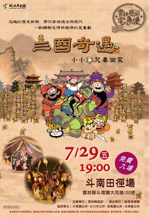 雲林縣政府規劃一系列「藝術宅急便下鄉巡演活動」,首場紙風車兒童劇團7月29日晚上7點在斗南田徑場演出《三國奇遇》,有小朋友最期待的互動設計,「超級火神箭」、「雷公彈」,會在觀眾頭頂上空飛來飛去,演出現場一下子就變成三國時代黃巾賊與劉備、關羽、張飛對戰的場景,觀眾彷彿進入「黃巾之亂」的歷史空間,成為戲中的群雄之一。