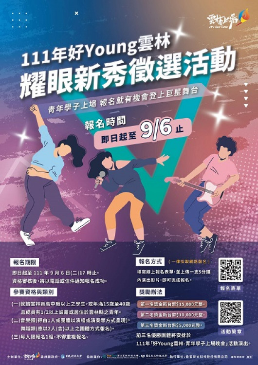 一年一度「好Young雲林-青年學子上場晚會」三校聯合演唱會預定10月中旬盛大登場,除邀請多位重量級藝人演出外,首度辦理「好Young雲林-耀眼新秀徵選活動」,公開徵選有表演才華的雲林在地青年,前三名除可獲得豐厚獎金外,還能登上「好Young雲林-青年學子上場晚會」與藝人同臺表演。徵選活動自即日起至9月6日下午5點止受理報名,歡迎就讀雲林縣高中職以上之學生,或年齡介於15歲至40歲且團隊成員有1/2以上設籍,或居住在雲林縣的青年個人或團體踴躍報名參加,成為耀眼的雲林新星。