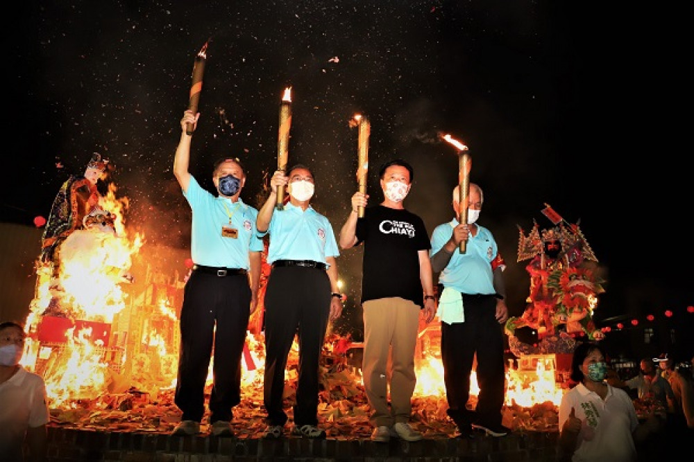 為祈求縣境平安,翁章梁縣長引領數千名信眾從廟前出發,沿路跟著紅燈籠,恭送大士爺到民雄交流道旁火化場完成最後的團拜儀式,隨後手持火把引火點燃,深夜熊熊火光映照信眾眼裡,帶來安定人心力量,既熱鬧又隆重,活動完美落幕,期待來年再會。