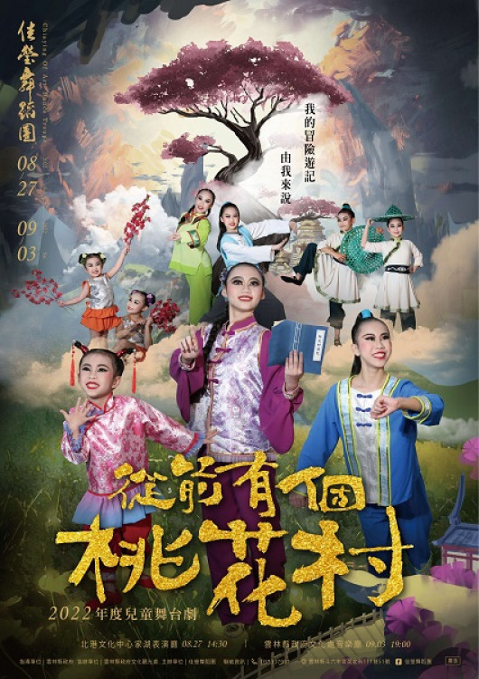 佳瑩舞蹈團9月3日(六)晚上7點在雲林表演廳進行全新年度大作《從前有個桃花村》售票演出,《從前有個桃花村》富有「想像力與創造力」劇情,配合舞者力與美肢體展現,深刻呈現舞劇概念與藝術表現,是一部關於成長與想像力的奇幻冒險舞台劇。