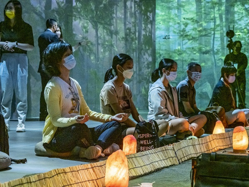 臺北醫學大學在臺北101首度舉辦沉浸式體驗展,首創將正念冥想結合五感聲光裝置,讓體驗者在忙碌的都市生活中,彷彿身歷其境置身銀河、徜徉大海、隱居森林,幫助人們身心放鬆減壓,舒緩焦慮、疼痛與失眠等症狀,提升身心幸福感。