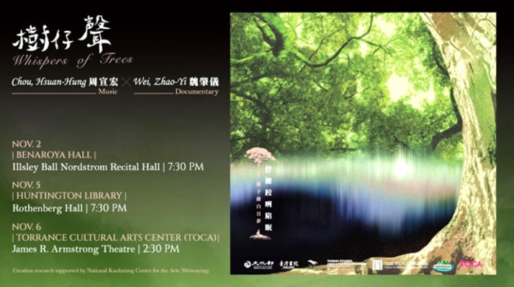 由衛武營國家藝術文化中心「高雄雄厲害」演出創意計畫催生出的《樹仔聲》聲景音樂會,將首度赴美西巡演,11月2日、5日及6日先後至西雅圖貝納羅亞音樂廳、洛杉磯杭廷頓圖書館及加州托倫斯文化藝術中心演出。《樹仔聲》聲景音樂會2021年在衛武營首演,由青年作曲家周宣宏與青年影像導演魏肇儀跨域共創,以「樹」為核心,搭配於高雄進行紀錄、影像、聲景、音樂的創作,突顯人類與自然的共生關係。音樂會的創作理念因為在美西受到廣大的認同及實踐,洛杉磯臺灣書院很快便媒合到當地演出夥伴,兩位藝術家也將赴美出席,透過演後座談與現場觀眾交流創作理念。