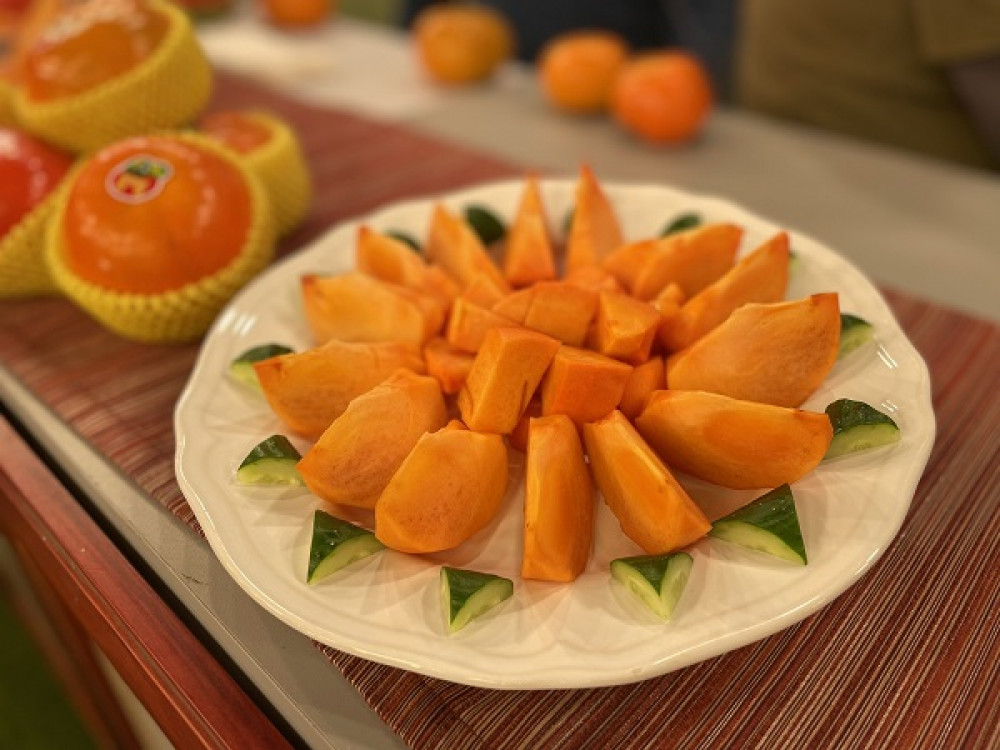 台中甜柿面積1,873公頃、產量3萬2,000公噸,為全國第一產地,又以和平區、東勢區種植最多,栽培品種主要以富有、次郎與花御所為主。其中,「富有」果皮橙紅色,色澤鮮豔,果頂渾圓飽滿,果肉粉質緻密、汁多,正是富有甜柿最佳嚐鮮期;「次郎」特色為果實呈扁平四方狀,具有明顯的四個凹溝,表皮光滑,顏色澄紅,肉質細緻綿密,香氣濃郁,口感清脆;「花御所」果實為扁圓球形、渾圓飽滿,果皮橙紅色,果肉緻密且富含漿質、汁多,糖度約17度,果肉品質佳。