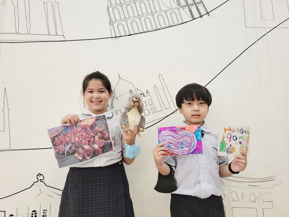 文雅國小三年級兩個班與英國Hursthead Junior School三年級學生進行交流合作,透過「泰迪熊計畫」交換方式,將在地特色介紹給對方,期待透過交流增進彼此認識。日前英國Hursthead Junior School寄來包裹,60位師生齊聚英語教室進行「開箱」,學生們非常開心期待,裡面除卡片外,還有一隻可愛的松鼠布偶,代表英國學校來到嘉義市文雅國小學習。文雅學生希望讓英國同學知道嘉義市的噴水池圓環,還有市場裡好吃的杏仁豆腐。