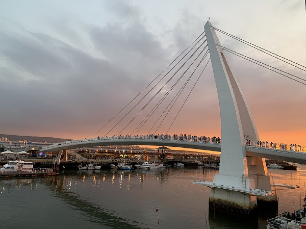 淡水漁人碼頭情人橋,20年前的西洋情人節正式啟用,定名為「情人橋」。白天、夜晚的情人橋各具一番風情,成為戀人們約會勝地—白天的情人橋猶如白色風帆橫跨在漁人碼頭,橋上也是觀賞淡水暮色的好所在,在橋上並肩依偎,絕美夕照與漁港美景盡收眼底。夜幕低垂後的情人橋,橋身在不同月份披上不同顏色的光雕,讓夜間的漁港每月呈現不同風情。