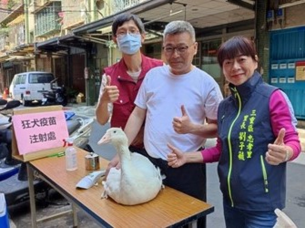 三重忠孝里長劉子毓表示,今年首次邀請動保處舉辦寵物狂犬疫苗和晶片注射活動。本地里民非常踴躍攜帶家中犬貓來排隊施打,沒想到居然連家禽鵝類也可以免費協助寵物登記。特別是替這隻「潤娥」注射晶片當時,飼主將布巾遮蓋頭部按壓身體彷彿哄小孩似唸說著”別怕別怕..”場景相當溫馨逗趣。