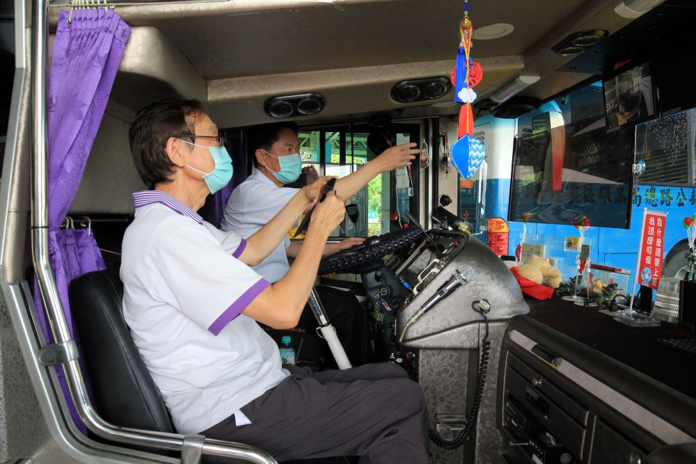 監理所商請高雄客運公司支援一輛大客車,提供駕駛人實際操作視野輔助,實際比對後照鏡視角與視野輔助畫面視角落差,不僅駕駛人得以現場驗證課堂所學,也加深印象。