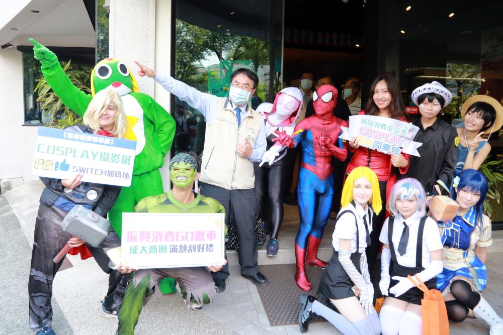 「振興消費來台南 COSPLAY蝦拼同樂會」,29日(六)在台南成大會館前熱鬧展開,市長黃偉哲化身「台南隊長」手持「台南振興盾牌」,與台南應用科技大學COSPLAY同好研習社成員、經發局長陳凱凌、東區區長陳勝楠、成大商圈理事長王智永及多位市議員等揭開活動序幕。