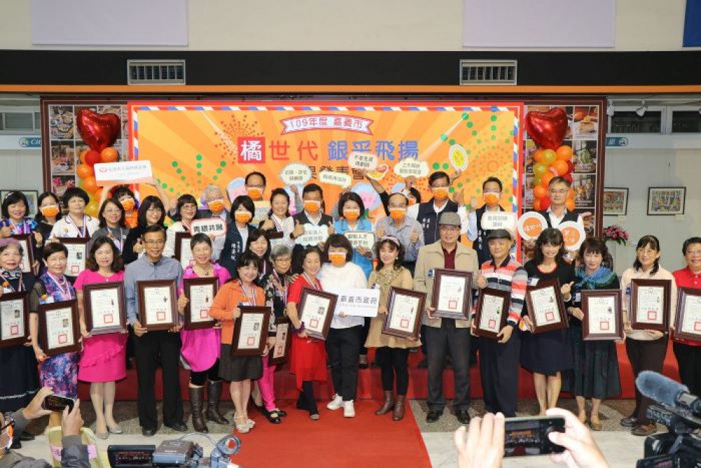 嘉義市政府與弘道基金會、雙福基金會、瑞泰長照中心、興仁、劉厝社區及國華杏福檜樂福利協會5日(六)在市府1樓中庭辦理109年度嘉義市橘世代銀采飛揚成果發表及大齡宣講、銀采達人授證典禮,共計27位,同時展現今年「銀髮人才資源中心」及首創「大齡自我挑戰圓夢」計畫執行成果,預告110年1月1日起「銀髮人才資源中心」將轉型為「橘世代生涯發展中心」。