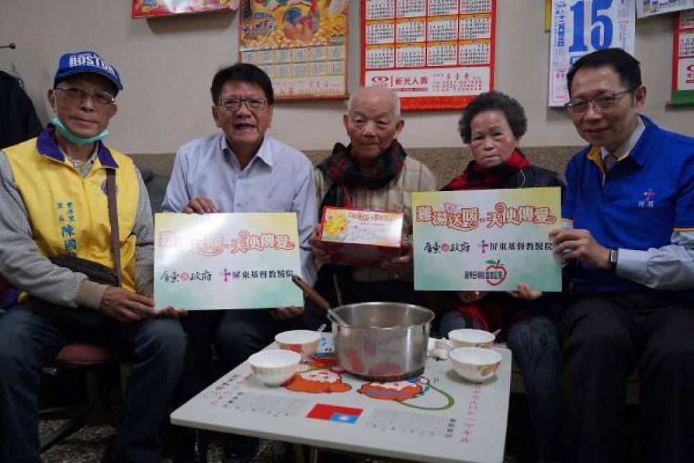屏東縣政府與屏東基督教醫院等單位合作,獨居老人雞湯送暖活動邁入第19年。縣府15日(五)舉辦「雞湯送暖開跑活動」,由潘孟安縣長化身為暖心志工,到方姓夫婦家贈送今年第1份雞湯,與長者聊天評估居家需求,檢視方家的無障礙空間、住警器等設施。潘孟安說,將送出3332份暖心雞湯,期許在這新年讓獨居長者不只暖胃,更能暖心。