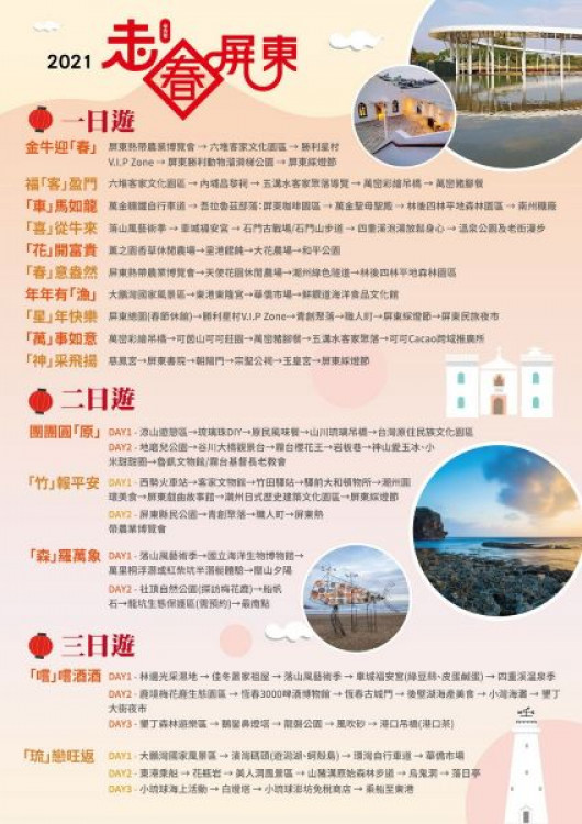 7天春節連假到來,屏東縣政府推出15條牛年走春主題遊程,從客家、原民、自行車、自然生態、節慶活動至新穎觀光景點,讓您感受屏東多一度的熱情,用主題遊程深度體驗不一樣的屏東。