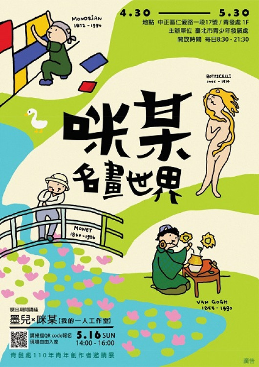 「咪某名畫世界」展覽即日起展到5/30,每日8:30至21:30,在青發處1樓展覽區免費參觀(臺北市中正區仁愛路1段17號)。展期間除舉辦講座外,也會有咪某周邊商品抽獎活動,相關資訊請上青發處FB及IG粉絲團查詢。